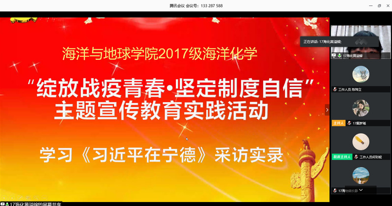 5月2日至5月5日,在全国疫情防控阻击战取得重大战略成果的关口,同时也是五四青年节期间,为深入学习宣传贯彻习近平总书记关于疫情防控工作的系列重要讲话和指示批示精神,激励和引领广大青年进一步坚定文化自信和制度自信,在党和人民最需要的地方贡献力量、绽放青春,海洋与地球学院面向全院青年开展“绽放战疫青春,坚定制度自信”主题宣传教育实践系列活动,取得了积极有效的成果。