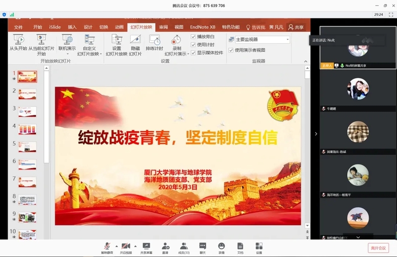 当天晚上7:00,研究生海洋地质党支部、团支部开展了“绽放战疫青春,坚定制度自信”线上主题党团课。海洋地质党支部、团支部全体成员,学院各团支部代表、团委副书记侯佳君老师等参与了本次团课。此次党团课分“全面推进复工复产,打赢脱贫攻坚战”“福建省五一期间疫情防控政策”“全面脱贫过程中大学生的使命与担当”三个部分进行,向同学们介绍了目前我国全面推进复工复产、复商复市的情况,以及开展2020年脱贫攻坚收官之战的现状,并带领同学一起学习了习近平总书记重要批示。党团课上,同学们还进行了热烈的互动交流,分享了自己的心得体会。同学们纷纷表示要积极投身战“疫”,用实际行动为脱贫攻坚、祖国的发展贡献自身的力量。