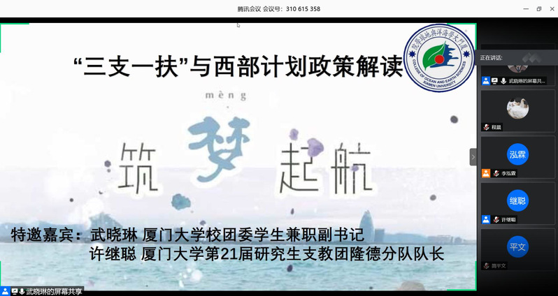5月3日下午,海洋与地球学院五四系列活动之战“疫”无忧就业云辅导——国家三支一扶、西部计划政策宣讲活动成功举办。本次活动通过腾讯会议举行,特别邀请了厦门大学团委学生兼职副书记武晓琳和厦门大学第21届研究生支教团隆德分队队长许继聪作为主讲嘉宾。本硕博约50名同学参与了本次活动。
