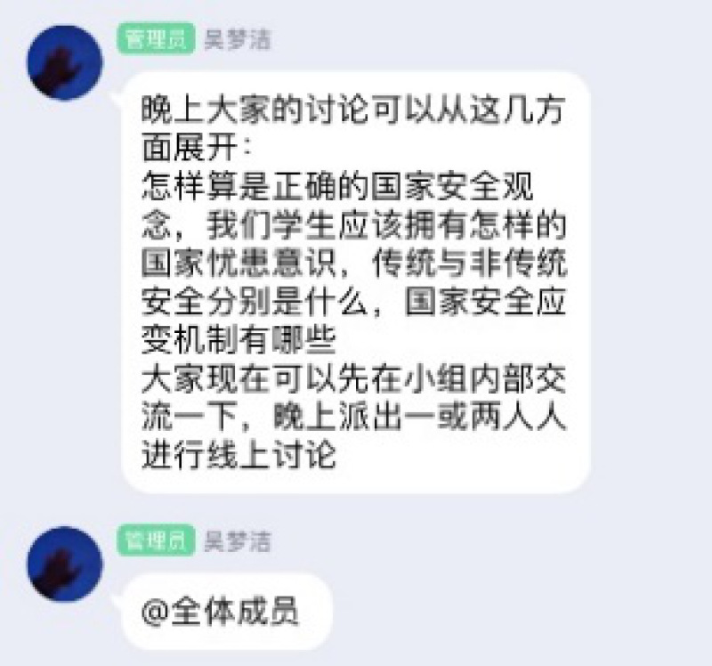 2019级的团日活动也多姿多彩。4月14日,所有2019级学生于团日活动同上了一堂国家安全教育课——范维澄《总体国家安全观视角下的疫情防控》,并且通过QQ群进行分享和讨论。同学们深刻地认识到:国家安全对于国家的稳定和发展至关重要,而且国家安全与每个国民紧密相关。例如:在使用电脑时,要注意不在机关单位内网专用电脑上使用无线设备及外单位的存储介质;及时更新杀毒软件,加强对病毒的防范;不得在军事基地、军用港口等地方拍摄照片,更不可上传至网络;发布网络信息要谨慎,不得在社交平台发布危害国家安全的言论和照片;特产不能随便带,其中可能含有对生态环境具有毁灭性威胁的有害生物,会对国家生态安全造成威胁……