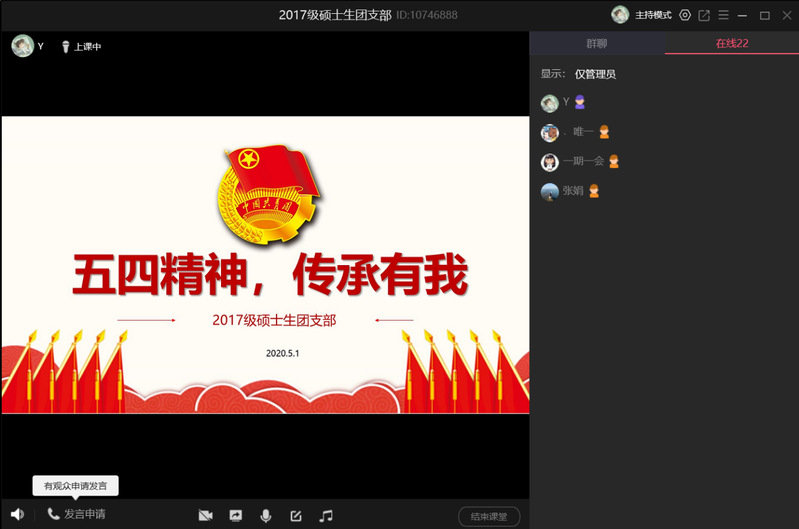 2020年5月1日下午,为迎接即将到来的五四运动101周年,激励青年大学生弘扬忧国忧民、热爱祖国、积极创新、探索科学的爱国主义精神,教育研究院2017级硕士生团支部组织开展“五四精神,传承有我”主题团日活动,活动通过QQ群课堂进行。
