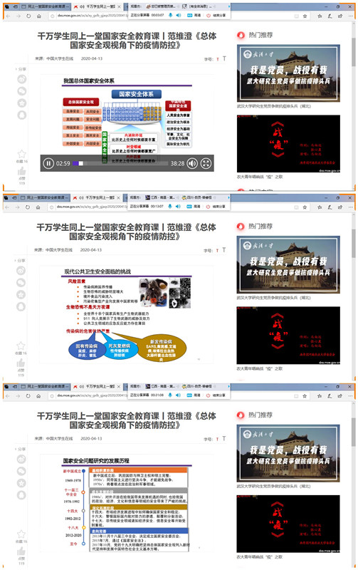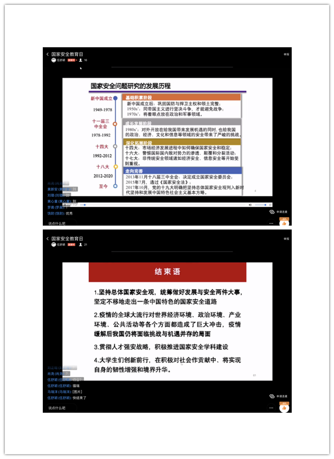 19级化工二班团课:由于此次疫情的影响,同学们无法相聚厦园,于是2019级化二班团支部采取了线上讨论的方式来开展团课。同学们积极讨论、广开言路,从抗疫过程中的难忘与感动,到生物安全在国家安全中的重要位置,再到维护国家安全的责任与义务…… 每一个话题都展现了中国当代青年的责任与担当。国家安全,是祖国为你我布下最坚实的城垒。