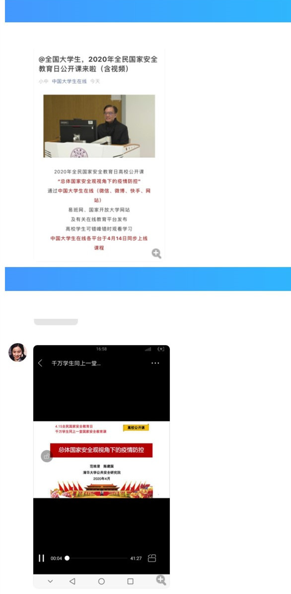 18级化学一班团课:在观看过国家安全教育课程后,2018级化学一班团支部通过QQ群开展讨论。通过这堂深刻的课程,同学们各有所获,并了解到:只有人人参与,人人负责,国家安全才能真正获得巨大的人民性基础,也才能有坚实的制度保障。
