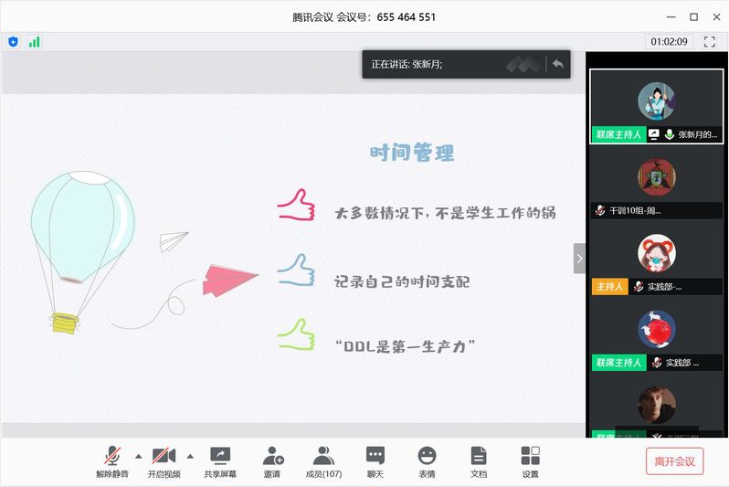 管理学院学生会副主席张新月结合自身体会分享了自己在开展学生工作中的经验与心得,她希望同学们正确认识学生工作:“要以不骄不躁、不卑不亢的心态对待,探索学生工作的更多可能性”。她还分享了自己在时间管理方面的小技巧,比如记录自己的时间分配、调整任务完成顺序,以实现学习与学生工作的平衡。关于沟通,她以分配任务时的DDL确定为例,提醒大家了解任务情况、掌握完成进度的重要性。