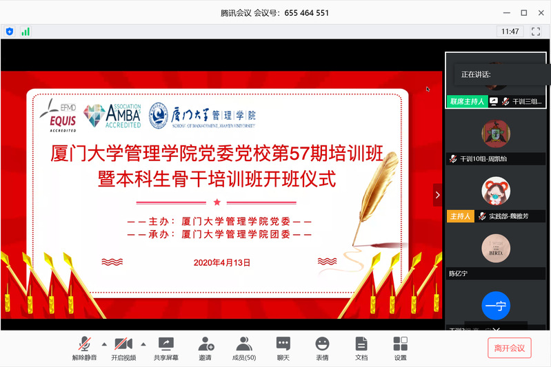 为打造一支政治觉悟高、人格品德正、感召能力强、业务能力精的学生骨干队伍,加大本科生学生组织建设力度,配合学院青年马克思主义者培养工程扎实推进,管理学院党委党校第57期培训班暨本科生骨干培训班如约上线。4月13日下午,培训班开班仪式于线上顺利召开。本次学生骨干培训由管理学院党委主办,管理学院团委承办。院党委副书记戴蓥,团委副书记吴荣梅、周颖,辅导员邵亢邑,第56期干训班优秀学员代表、2018级本科生刘子瑜以及全体干训班成员共聚线上参加会议。开班仪式由2019级本科生张超颖主持。