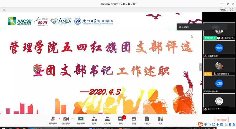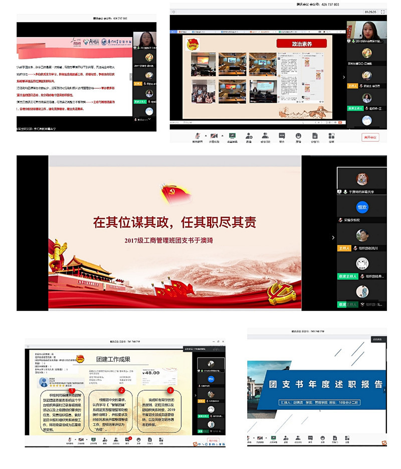 为集中评选过去一年中在团的各项工作中表现突出的基层团组织、团员和团干部,促进各团支部之间相互学习、交流,引导和激励青年团员继续在学院建设和抗击疫情阻击战乃至中国特色社会主义建设中发挥中坚力量,管理学院2019年度五四红旗团支部评选暨团支部书记工作述职活动本科生、研究生专场分别于4月3日、4月7日举行。活动采线上会议方式举行,管理学院全体团干、兼职辅导员出席活动。