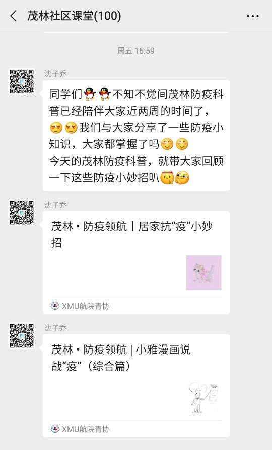 值得一提的是,来自人文学院的志愿者韩知霖同学的“小雅漫画说”系列推送以原创漫画的形式,形象生动、活灵活现地将知识图像化,用小朋友喜闻乐见的方式普及了防疫小知识。 图文并茂使得形式既不枯燥,又富有新意,这是本次线上茂林的一大亮点。同时人文学院同学的积极参与,也说明了“茂林小课堂“的魅力与成功。