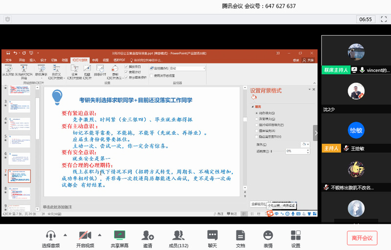 3月20日,公共卫生学院就业指导系列“云”课堂开讲啦!学院团委邀请校就业指导中心占群丽老师为毕业生开展主题为“疫情期间如何求职”的就业指导讲座。学院辅导员赵煜老师及本研毕业生参与学习。