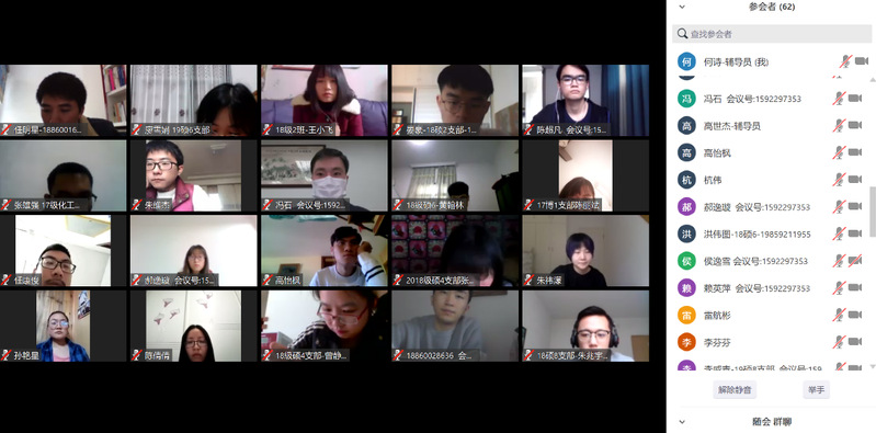 3月20日下午,因疫情期间要求,学院党委党校采取视频会议的形式在线上顺利完成了第76期(学生)党的基本知识学习班开学式。本次学习班学员为56位入党积极分子,其中本科生17人,研究生39人。学院党委书记、党校校长宋毅,学院党委副书记、党校副校长李芬芬,学院党委副书记刘俊杰和学习班带队教师参加本次会议并与56位学员进行了线上互动。会议由党委组织员林秀娟主持。
