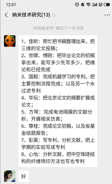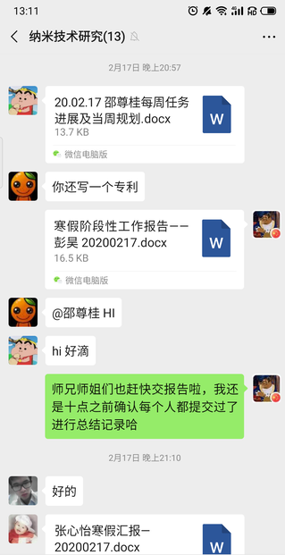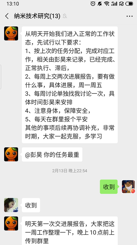新春之际,除了拜年问候,同学们每天的打卡签到、健康汇报成为了必修课。在学校发布延迟开学通知的第二天,郑高峰就制定了居家科研工作计划。他要求研究生在做好居家防护的同时,坚持学习、主动学习、擅于学习。引导研究生做好时间管理、科学规划,把每一天都过得充实而有意义。“居家不停学、科研不停滞”成为了课题组研究生最为关切的话题,每天早上8点半打卡成为学习工作的开端。2019级硕士生张心怡表示,“疫情期间我们每天在课题组群打卡,与老师、师姐讨论学习,每周汇报学习情况等,规律的作息充实了居家生活。”