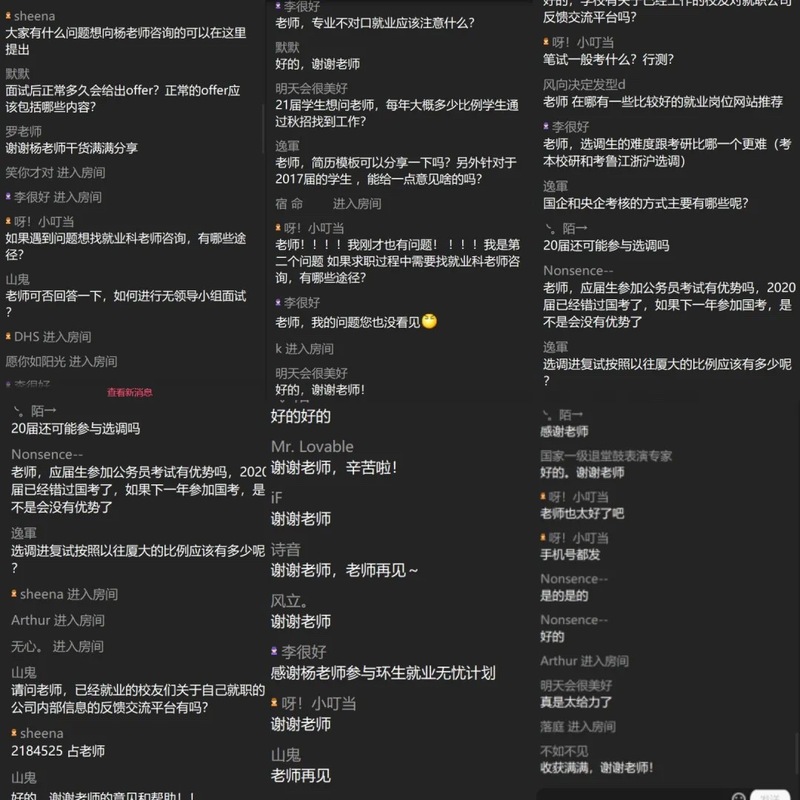 讲座结束前,同学们提出了自己所关注的问题,杨明伟进行一一解答,他详细且耐心的回答获得一致好评。直播结束后,同学们在群里提问的热情不减,杨明伟又继续详细解答了诸如选调生与公务员的区别、2019届毕业生的情况等问题,同学们大呼满屏干货,收获满满,纷纷点赞。