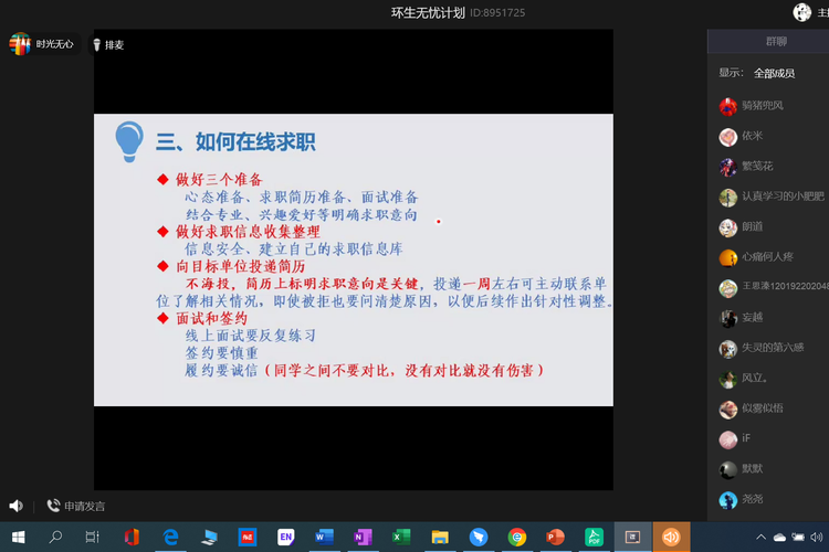 为鼓励毕业生在疫情期间积极参加网上招聘,帮助他们做好求职准备,环境与生态学院于3月13日下午举办在线求职指导讲座,此次讲座作为“环生求职无忧计划”的一部分,邀请了学生处就业指导科科长杨明伟作为主讲人,讲座通过QQ群课堂在线进行,80多名来自各学院的学生参与讲座。