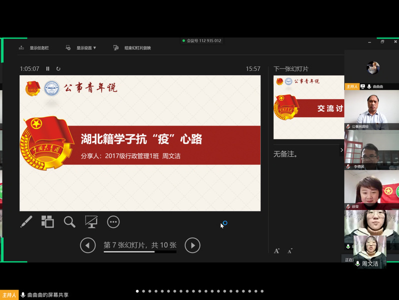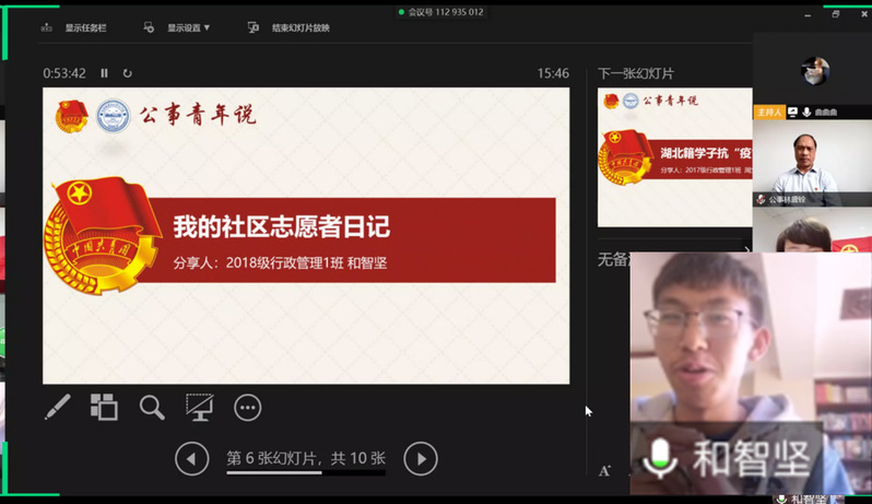 在疫情防控工作中,公共事务学院有许多青年学生积极响应党团号召,投入到社区志愿服务工作中。参与家乡社区战“疫”的学生志愿者代表、2018级行政管理专业本科生和智坚,湖北籍学生代表、2017级行政管理专业本科生周文洁先后分享了自己参与防疫工作的心路历程。和智坚介绍了家乡防疫开展的情况和感人故事,分享了自己参与“战疫”志愿服务的体会。周文洁同学从湖北籍学生的视角介绍了疫情发生以来疫区政府、社区、老百姓们积极对抗疫情的亲身经历,对学校、学院和老师同学们的关心、支持和帮助表达了感谢。