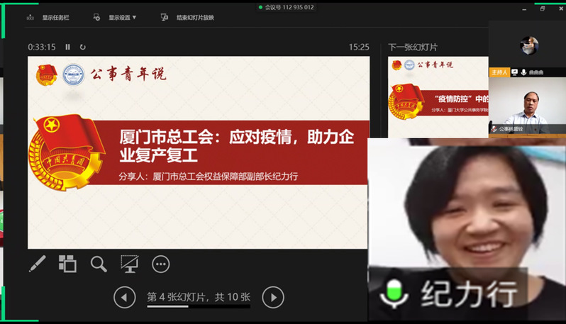 3月13日下午,在公共事务学院党委的指导下,学院团委以线上“云”课堂的方式组织开展了以“公事青年说——青年在行动,守护‘疫’防线”为主题的微团课。本次团课邀请到党的十九大代表、厦门市前埔北社区党委书记陈建萍,厦门市总工会权益保障部副部长纪力行,公共事务学院副教授李德国,学院参与社区志愿服务的青年团员代表和湖北疫区学生代表分享各自关于此次疫情防控的体会。校团委副书记林蕊、公共事务学院党委副书记林盛铨、学院团干、2017级行政管理1班本科生团支部、2019级行政管理本科生团支部共计81人参与了本次微团课。团课由学院团委书记徐莹主持。