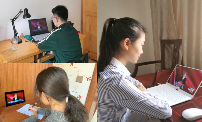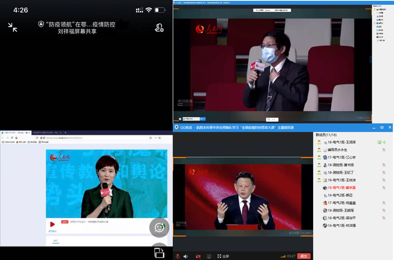 “防疫领航”在鄂先锋党支部、留校学生党支部、本科青年突击预备队三支学院抗“疫”一线学生集体,自发组织全体成员观看直播,并与同学们热议学习体会。