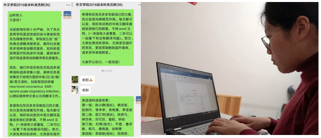 面上展开,传递青春正能量。积极动员广大学生党员、团员立足学科特长,为疫情防控贡献外文人的力量,体现战“疫”一线的青春担当。成立战“疫”先锋志愿翻译服务站,组织学生党员帮助院友翻译新型冠状病毒肺炎防疫物资清单,帮助厦门市公安局出入境管理支队完成“疫情防控承诺书”英语版、日语版、俄语版的翻译,组织近40名学生志愿者参加“战疫无忧”云辅导爱心行动,为厦门驰援武汉的医护人员子女提供学业辅导员,向“最美逆行者”致敬,做他们最坚实的后盾。