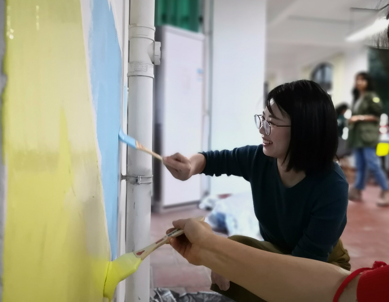 对学院负责管理的四个空间如何进一步细致美化,经过前期的多次碰头会,确定了设计稿后,正式开始装饰布置!罗书记带领辅导员们数次对宿舍园区连廊空间实地走访,党团活动室的设计成品上墙后,因消防刷不能遮挡,实际效果不美观。团委书记蒋玉塔带队去省里比赛时,还特意拍回团省委的消防栓美化图,设计师慧玲又重新修改设计。11月底,学院的辅导员和学生们在总设计师郭慧玲老师的指导下开始“创新创业工坊”墙面的上色工作。蓝色和黄色交叉格子的墙面绘制形式,色系青春活泼,充满活力,每个进入到“创新创业工坊”的同学都觉得眼前一亮。