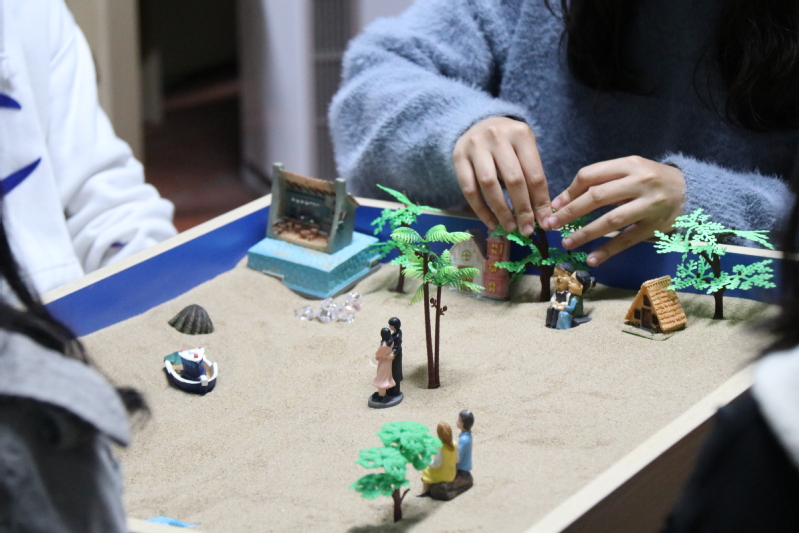 本期讲座以“团体沙盘”为主题,医学院辅导员谢婷玉应邀参加,为本科班级心理委员提供指导和培训。首先,谢老师为在场心理委员介绍了沙盘游戏的理论基础、相关规则及注意事项,并带领大家进行了团体沙盘的体验。心理委员们将理论知识和自身实践经验相结合,大家一起摸索,利用沙子、沙具等工具,体验沙盘游戏疗法的神奇。随后,大家分享了制作过程的感受,对摆放的沙盘游戏作品进行心理学方面的探索与研究。
