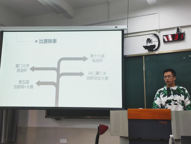 王福骏学长2018年获得了央视网全国金牌实习生的称号、全国高校大数据应用创新大赛二等奖、2019年获得了挑战杯学术科技作品社科类二等奖和中国互联网+大学生创新创意比赛福建省金奖的荣誉。他重点分享了参赛过程中的故事,语言生动形象,幽默轻松。现场同学们笑声不断,气氛活跃。同时他还分享了如何根据兴趣、专业、能力等标准选取队员,给了同学们很大的启发。他还将创新创业赛事细化为了专业类,创新创业类,社会实践类,案例类等类别,并形象地归纳了同学们参加比赛的几个阶段,让同学们更直观了解比赛的类别和自己所处的阶段,以此为基础选择自己想要挑战的比赛。