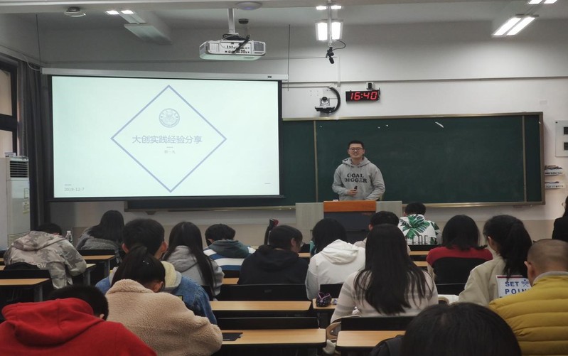 财政系的程一凡学长作为2018年“寒假招生宣传”专项社会实践队长,“青年大学习,奋斗新时代”社会实践积极分子,同时也是2019年寒假“我眼中的新中国”专项实践社会优秀团队的一员,他从不同的角度向学弟学妹分享了自己对于创新创业大赛的看法和经验。在分享过程中与前两位嘉宾不同,他着重介绍了大赛申请流程,并建议同学们在选题方面应与老师多沟通,选择当下热点贴近实际的选题。同时他还强调了实验报告的撰写的格式可以多加参考往年的优秀报告。学长细致全面的分享,使同学们对比赛的各个环节和细节也有了更深入的了解。