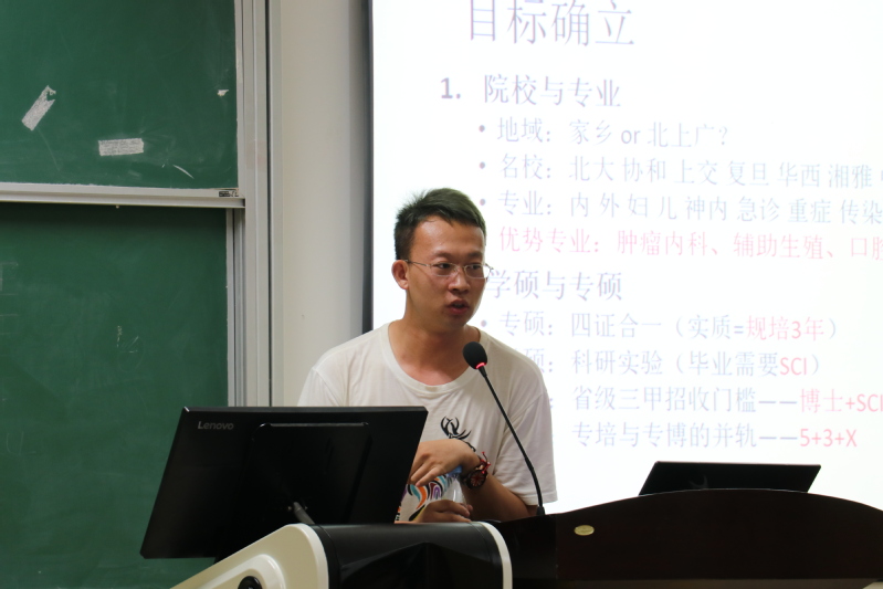 2019年6月25日晚八点半,在爱礼楼104成功举办了2019年保研考研系列讲座。主讲人是2013级临床医学本科生杜冰,2018年经全国统考以386分内科第一进入北京大学人民医院血研所,专业型研究生,方向多发性骨髓瘤。各年级各专业学生都慕名前来参加讲座。