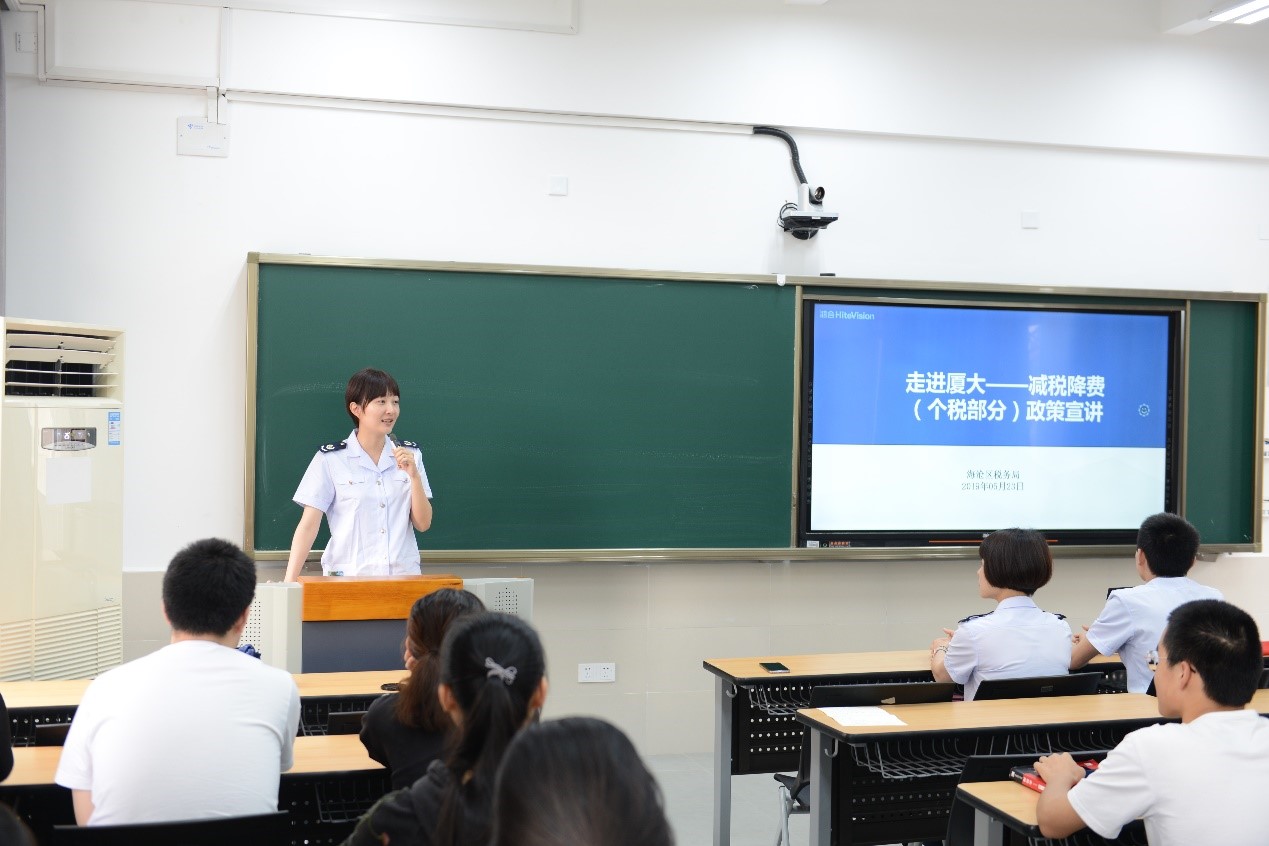 海沧区税务局党团员突击队曹洋首先发言,她表示,很怀念自己在厦大发奋读书的青春时光,并以此勉励同学们认真学好专业知识,为实现中华民族伟大复兴的中国梦奉献自己的力量。她还深入浅出地从专项附加扣除政策指引、新个人所得税法扣缴申报两部分详细地介绍了国家最新的减税降费政策。