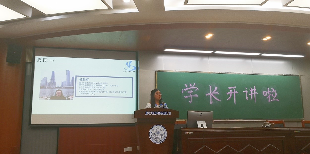 2019年5月18日晚19:00,由厦门大学经济学院就业创业指导中心举办的第四期“学长开讲啦”讲座在经济学院N302教室成功举办。本次讲座由人力资源部部员张时雨主持,2016级金融学硕士杨雅真和2015级统计学本科张毅农依次为同学们进行了经验分享。
