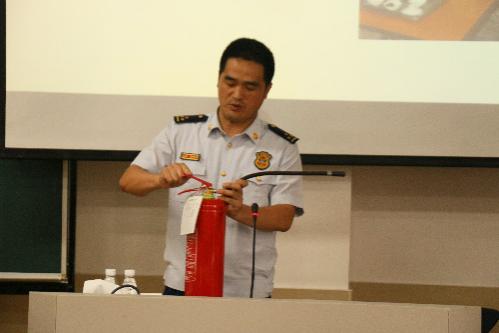 周强科长首先对在场师生进行了消防相关的理论培训。他分别从火灾危害影响、火灾消防相关负责人制度、切实排查生活中的火灾隐患等角度,结合现实案例辅以相关信息的阐述,讲解消防相关知识,包括在日常生活中对火灾的预防、火灾来临时的应急措施、如何进行正确的火情报警、生活中常见的消防设施等。同时,周科长还讲解了灭火器的使用步骤,以及如何用灭火器进行初起火情的灭火,并邀请同学上台现学现用,亲自示范指导灭火器的使用步骤。此外,周科长还给参加培训的师生带来了“小礼物”——印有“厦门消防”的口哨和手电筒,可于危急时刻派上大用场。