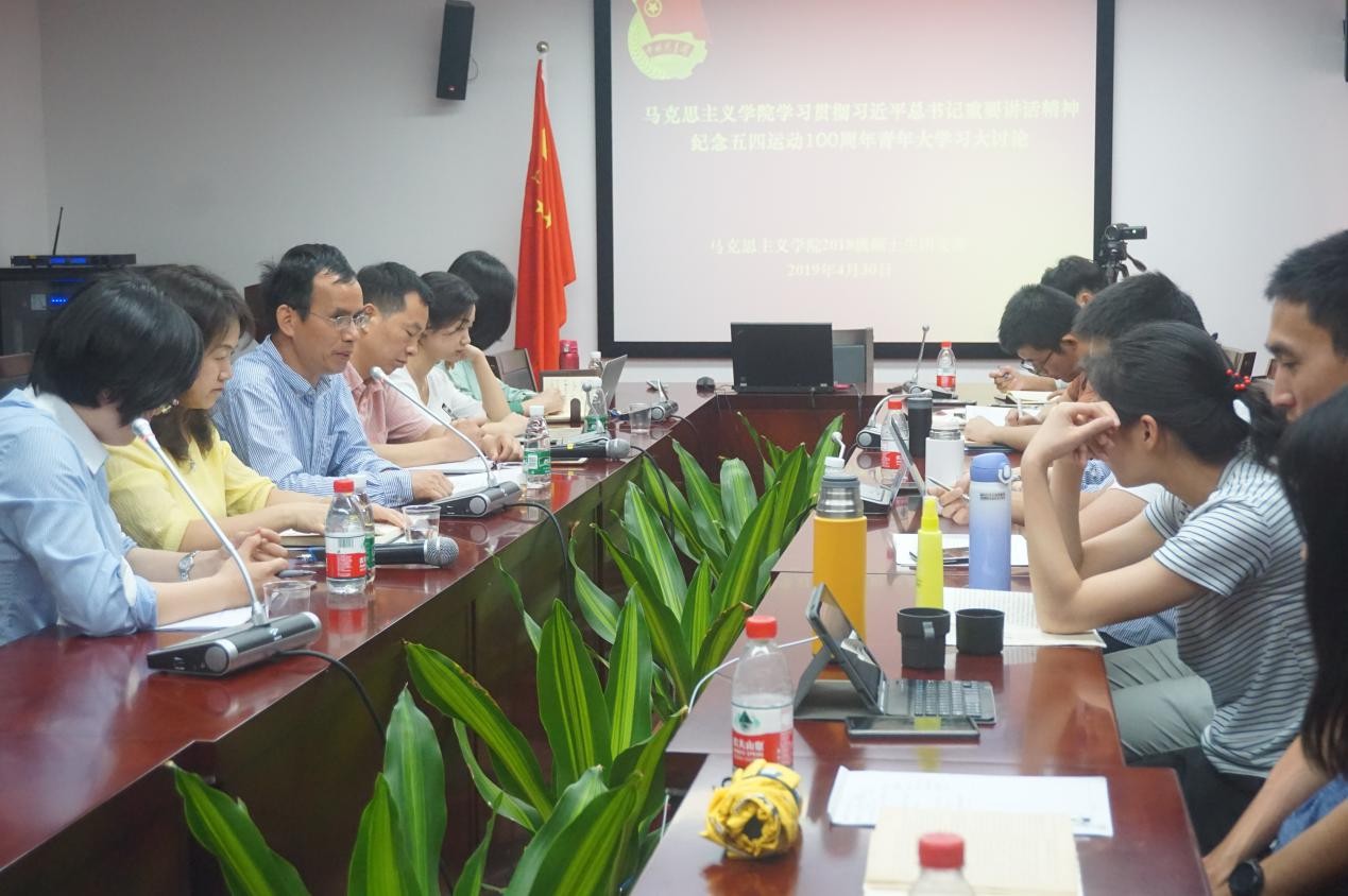 2019年4月30日上午,马克思主义学院学习贯彻习近平总书记重要讲话精神暨纪念五四运动100周年青年大学习大讨论活动在囊萤楼302会议室顺利开展。此次座谈会由团委书记蔡虎堂老师主持,学院党委书记侯利标、副书记原宗丽、学生工作处联络老师任艳青、青年教师代表庄三红、王奇琦以及2018级团支部团员代表出席了此次座谈会。