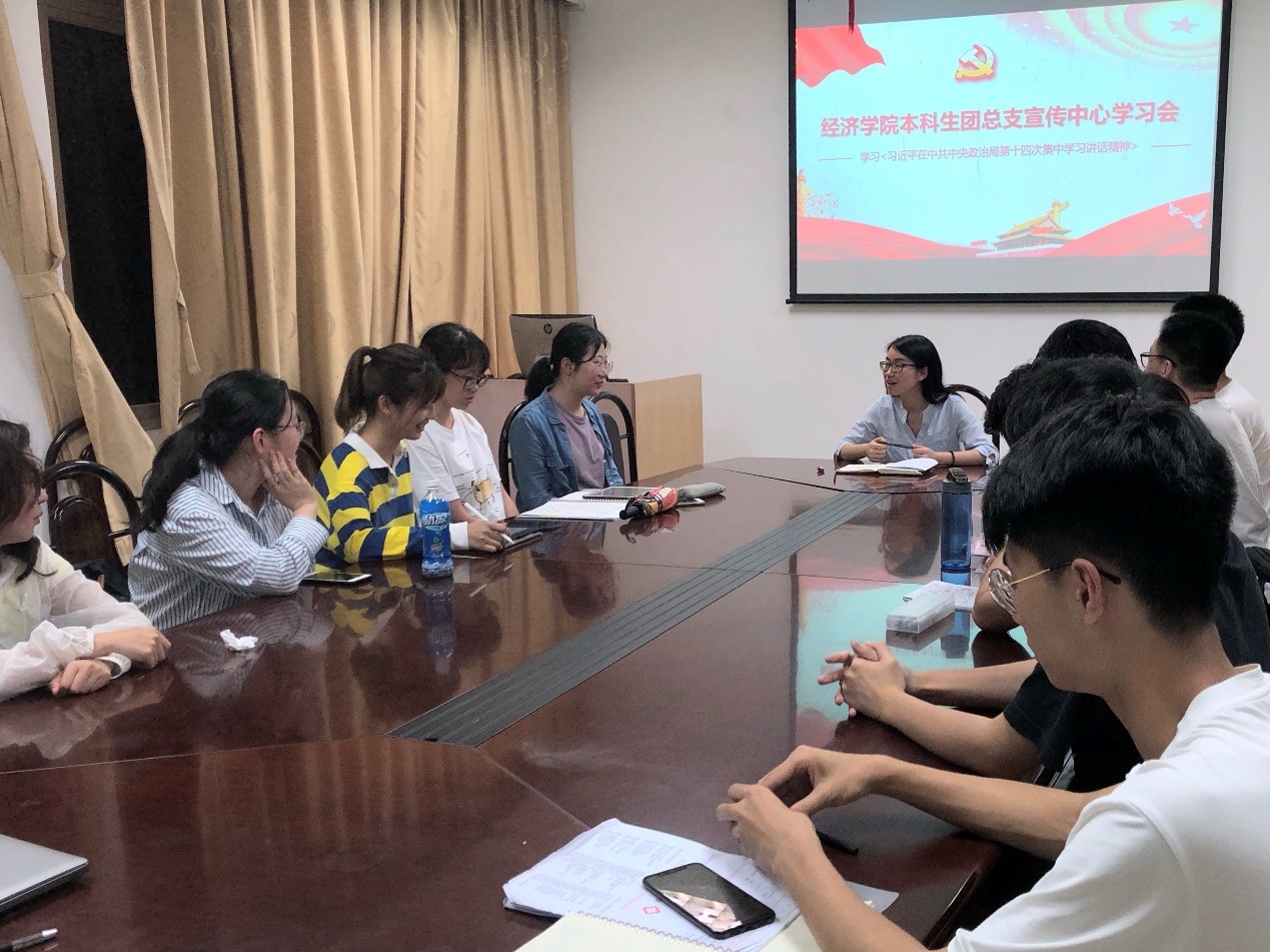 今年是五四运动100周年,为纪念五四运动、发扬五四精神,提高经济学院学生网络宣传骨干的理论素养,鼓励学生自觉参与到五四运动及五四精神的研究和传播中去,4月23日晚,经济学院本科生团总支宣传中心开展“百年五四·青春经苑”主题座谈会,深入学习习近平总书记在中共中央政治局第十四次集体学习上的重要讲话精神,会议由宣传中心指导老师林轶凡主持。