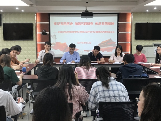 在五四运动100周年即将到来之际,中共中央政治局就五四运动的历史意义和时代价值举行第十四次集体学习,习近平总书记主持学习并发表重要讲话,充分肯定了五四运动的历史意义和时代价值,对新时代加强五四运动和五四精神研究指明了前进方向、提出了重要要求。4月22日下午,环境与生态学院学工组在金泉楼A239举行“牢记五四历史加强五四研究传承五四精神”——学习贯彻习近平总书记重要讲话精神座谈会。环境与生态学院党委副书记毛通双、团委书记林明华、辅导员蔡群飞、张璐婧以及学院学生组织临时党支部成员、研究生会委员、学生会委员、团支书参加座谈。座谈会由林明华主持。