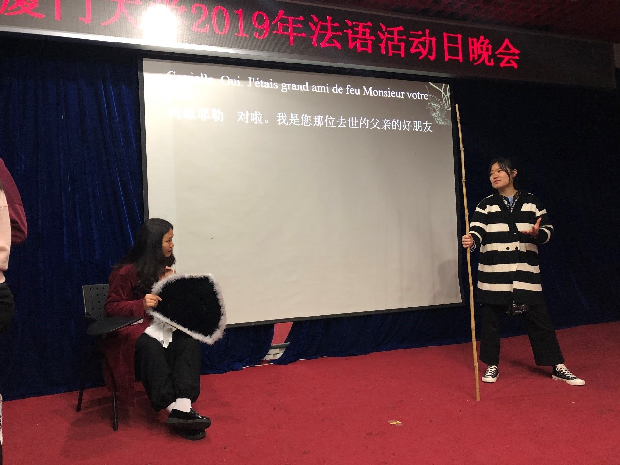 开场节目是由2017级本科生陈星霞、萧凤杰演绎的17世纪喜剧大师莫里哀的作品《贵人迷》选段,该表演在第三届全国法语戏剧大赛总决赛中荣获一等奖。晚会现场,两位同学精湛的演技仿佛将观众们带回了17世纪的法国剧场,赢得了阵阵掌声。