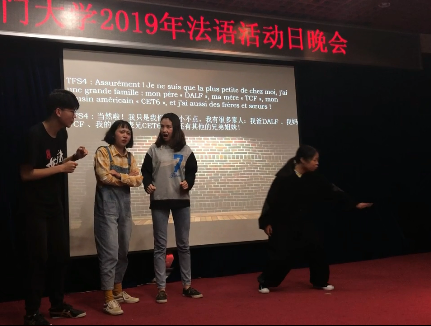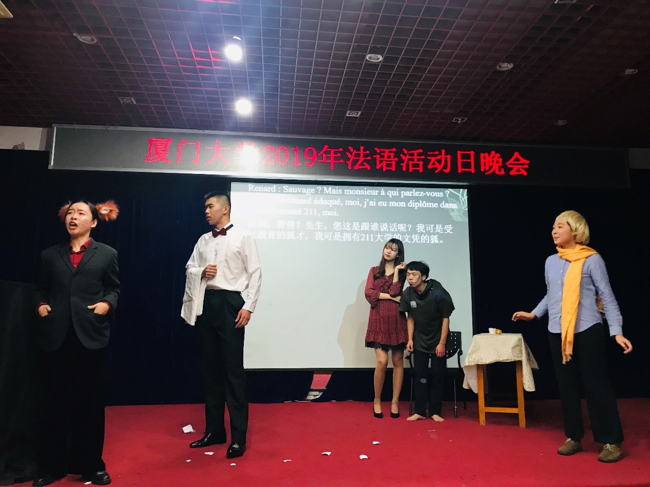 一年一度的法语活动日如约而至。4月1日晚,“厦大法语之夜”法语活动日晚会在自钦楼二楼多功能厅举办。晚会精彩纷呈,戏剧表演、电影配音、视频介绍、歌曲演唱等形式多样的节目为大家呈现了一场关于法兰西风情的视听盛宴,充分展现了文化交流碰撞的魅力。外文学院法语语言文学系主任鲁京明、副主任翁冰莹,法语系老师郭兰芳、沈澍、黄荍笛及外籍教师Guillaume LABOURDETTE、Honglin TRAN等出席了晚会。晚会由2018级硕士研究生钱雅蓉、武瑶主持。