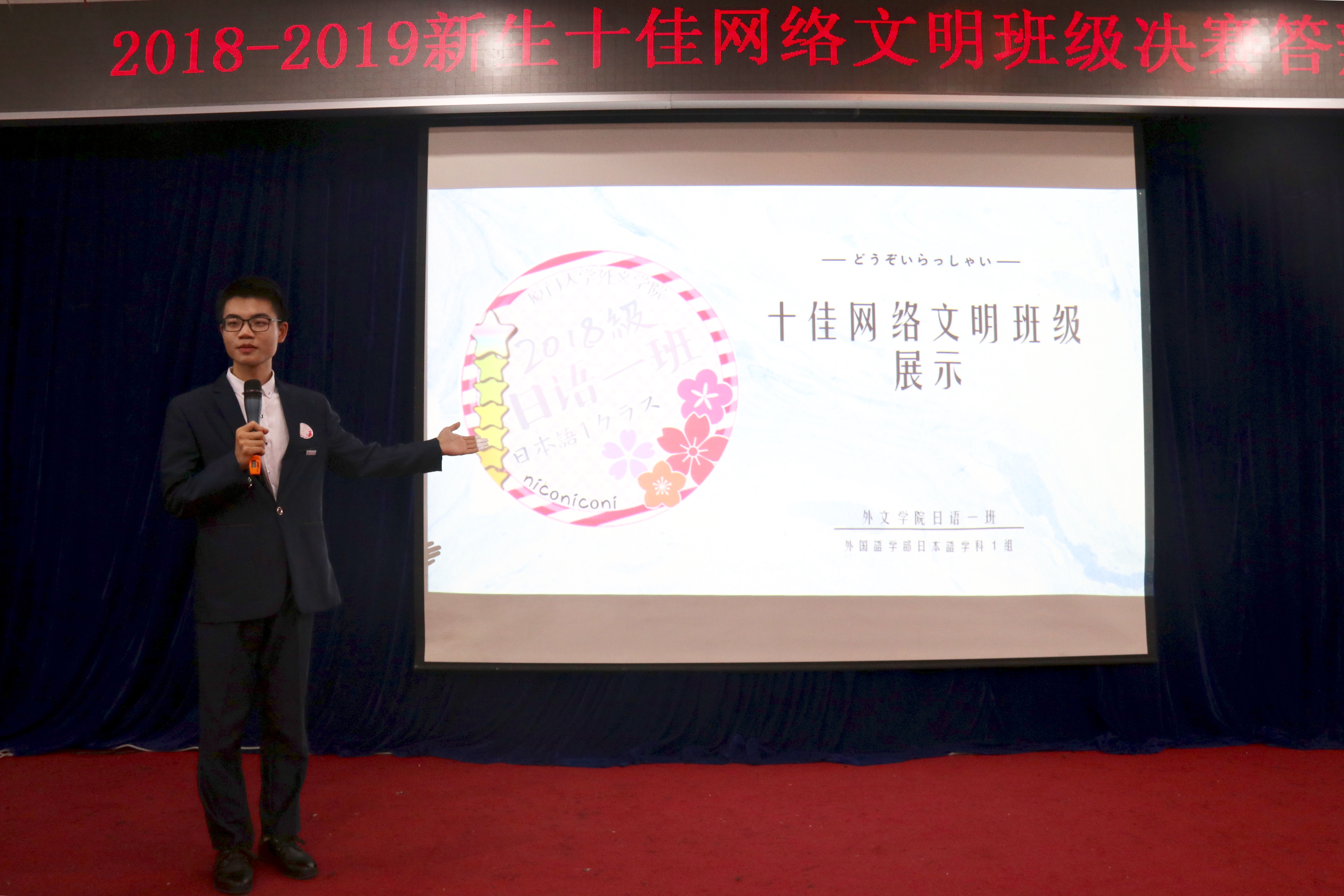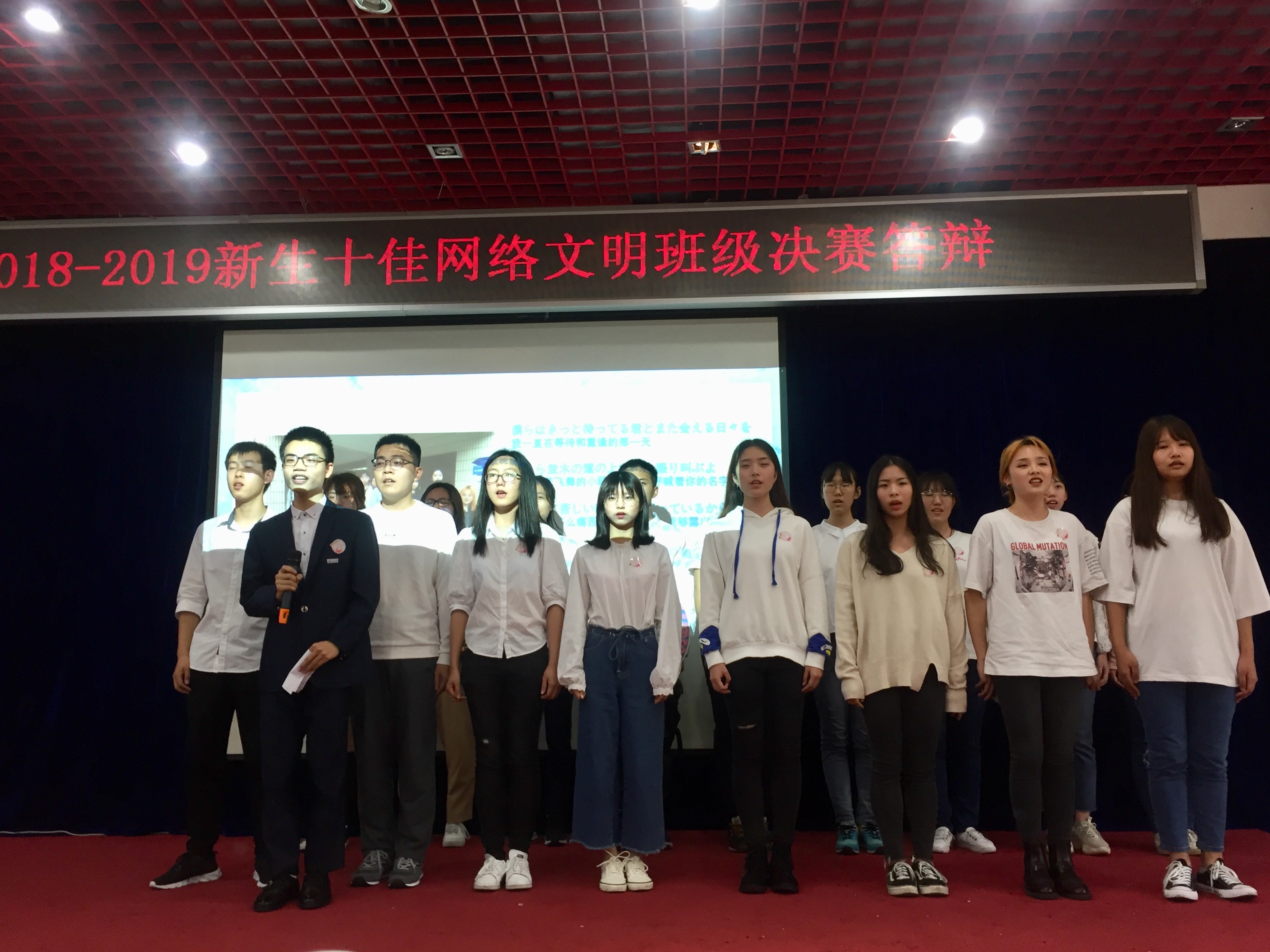 决赛的最终结果由线上投票、班级EGPA值和i厦大APP班级积分及现场答辩三部分组成。谢丰泽同学作为答辩代表,生动详细地介绍了班级依托易班网和 i厦大APP平台开展的各项线上线下活动,充分展示了班级网络文化和班级建设情况。同时,为进一步提升班级凝聚力,打造日语专业独特的班级文化,日专一班还精心设计了班徽,灵动的设计和丰富的内涵获得了评委的一致好评。最后,全体同学合唱了班歌——さくら(樱花),悠扬的曲调和感人的演绎赢得了在场观众的阵阵掌声。最终,外文学院2018级本科日语专业一班以优异的综合成绩荣获了“十佳网络文明班级”的称号。