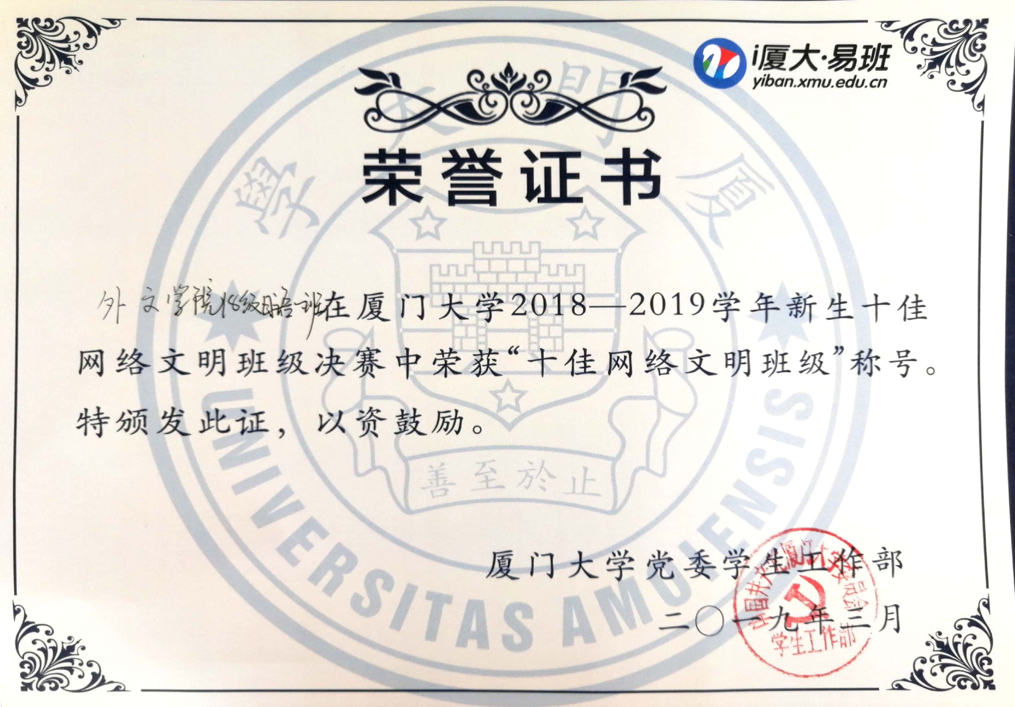 此次新生十佳网络文明班级评选活动旨在学习贯彻习近平新时代中国特色社会主义思想和党的十九大精神,落实全国教育大会精神、高校思想政治工作会议精神,创新网络思想政治教育,推动思想政治工作联网上线,增强工作亲和力和针对性,促进新媒体新技术在思想政治工作中的深度应用。在此次评选活动中,日专一班的同学们团结一致,主动投身班级网络文化建设,充分发挥易班和i厦大平台的育人功能,积极参与班徽设计、班歌编排、答辩演练等,丰富多彩的班级活动和班级互动进一步提升了同学们的凝聚力和向心力,展现了我院学子奋发有为、朝气蓬勃的精神风貌。