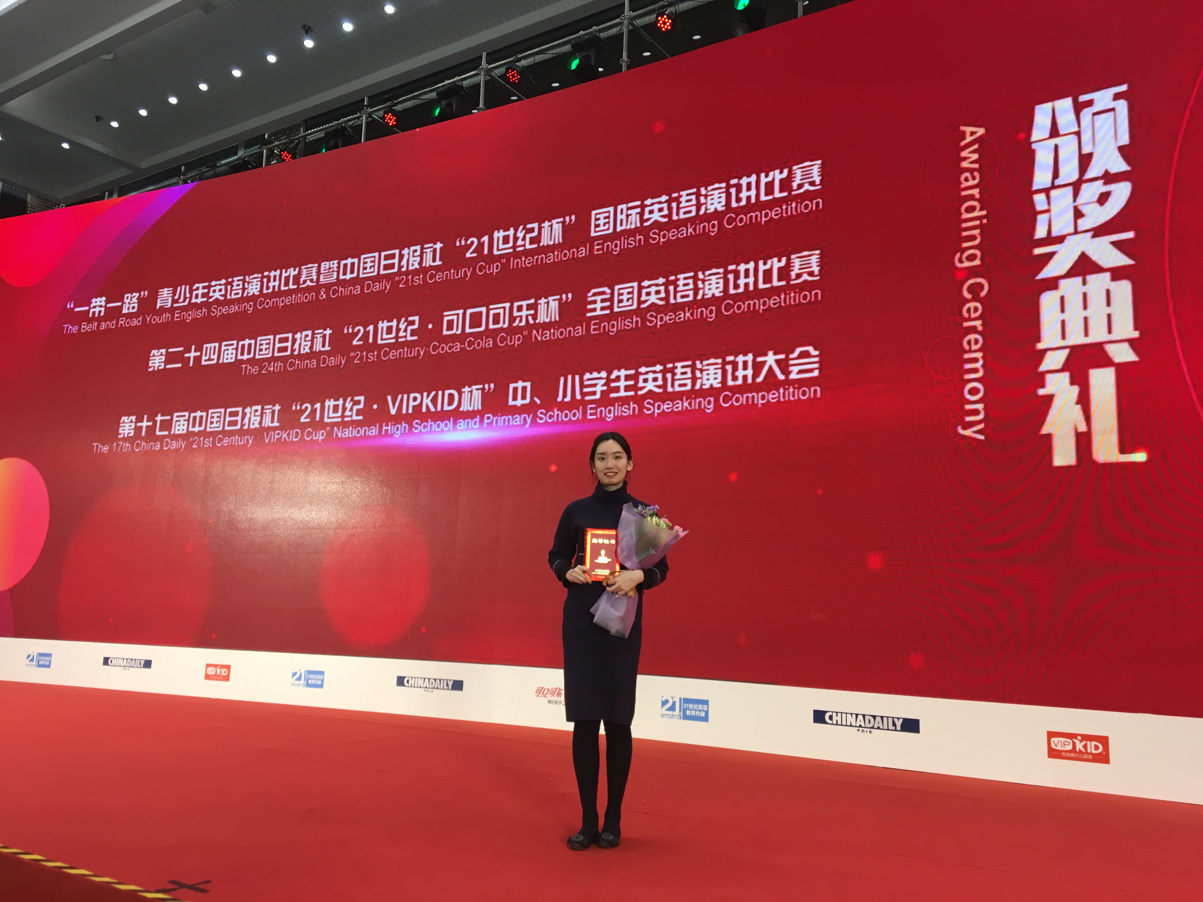 在第二天的总决赛中,袁嘉茵同学带来了“从‘流浪地球’到‘奇迹地球’,共建人类命运共同体”的深刻主旨演讲,并凭借冷静稳定的发挥和灵活的现场应变能力在之后的环节中均高水平发挥,再次获得了现场评委的一致肯定和认可。最终她获得了全国总决赛季军的佳绩,创下我校在这一赛事中的最好成绩。