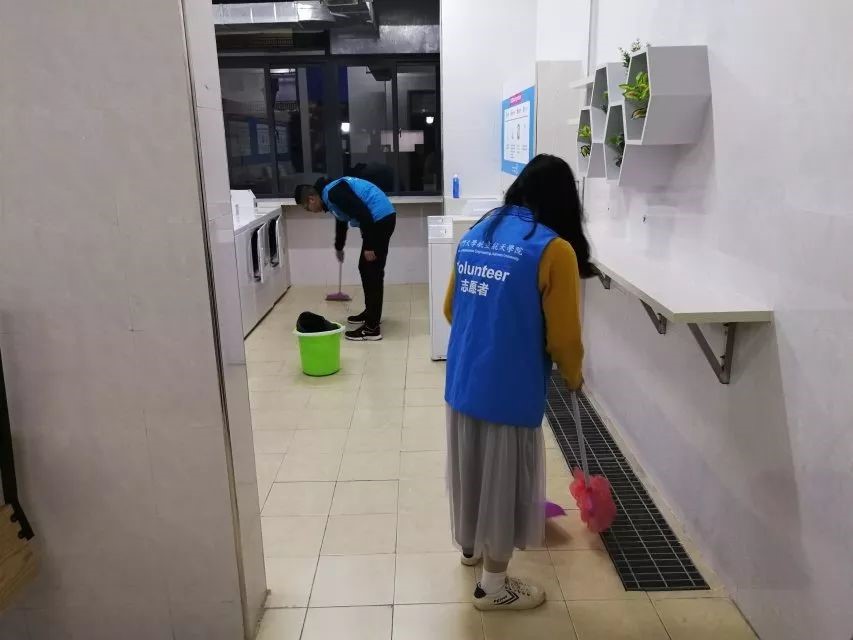 3月17日17级飞动一班的志愿者们来到同学们常常使用的映雪四、六洗衣房,打扫卫生,清理垃圾,摆放桌椅。