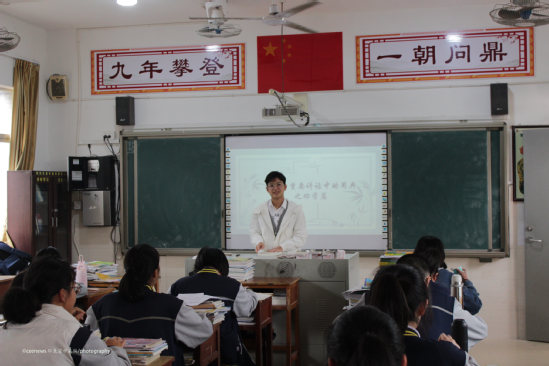 随后,由环境与生态学院3位大学生党员分别担任主讲,并带领6位志愿者担任助教对应三个班级开始授课。志愿者们紧密围绕红色经典为主题,又各具特色选择不同小主题,洪蒲滨、王鑫格、陈瀚哲3位主讲同学分别以“习近平总书记重要讲话中的用典”、 “《习近平的七年知青岁月》”、 “黄继光事迹”为题进行介绍。他们分别以典故、关键词、视频为课程核心,运用不同的方法引领同学们了解历史往事,用新颖有趣的方式宣传红色精神。而助教们则在台下积极地和同学们进行互动并解答同学们的疑问,以真诚热情的态度带动着同学们,讲师与助教的紧密协作使整个课堂活跃十足。刘五店中学的同学们仔细聆听,时不时热情回答讲师们的提问,现场氛围融洽和谐。