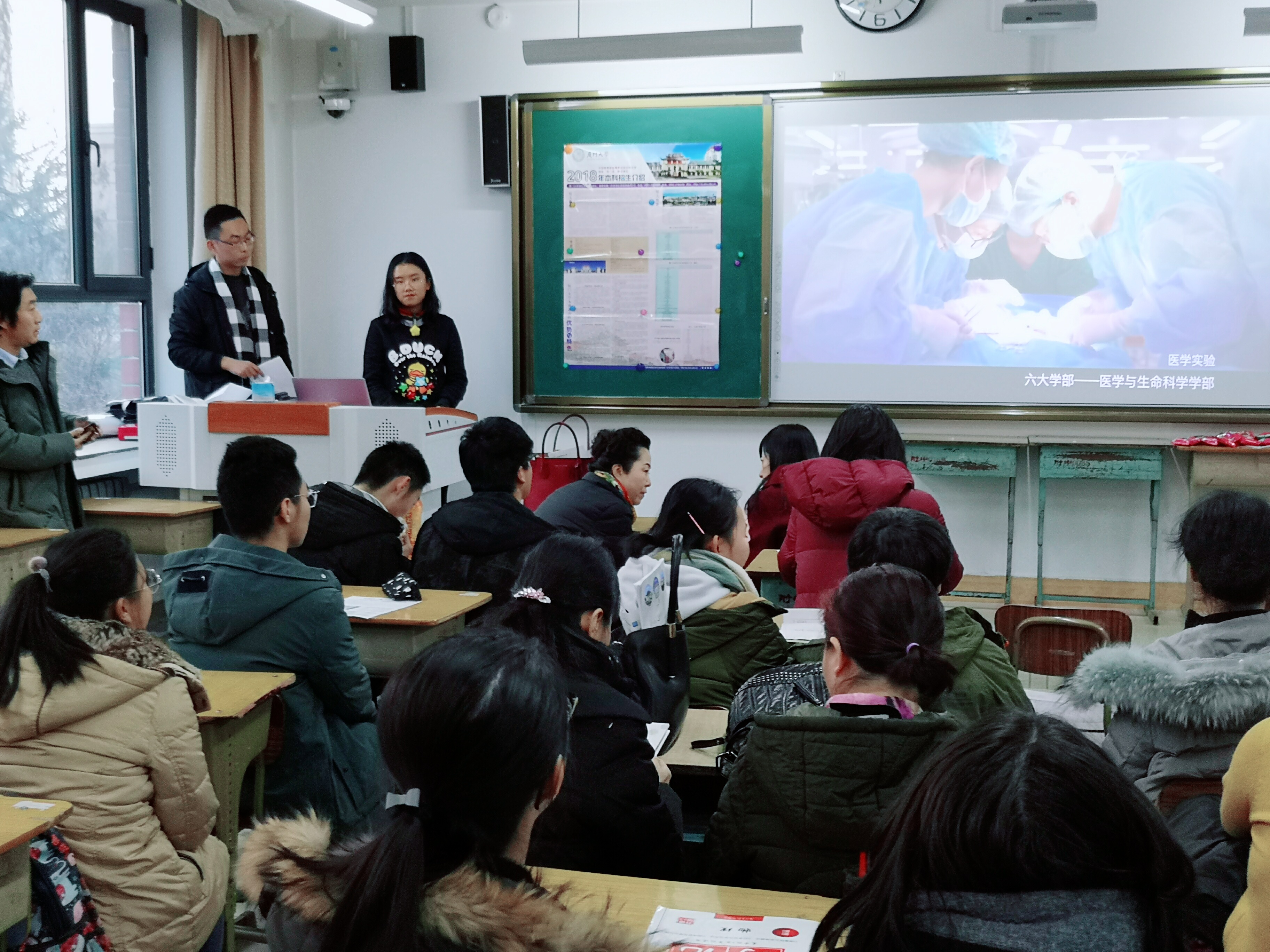 从初期撰写宣讲文案、制作PPT,到张贴海报、发放传单,再到进班宣传,实践队员们尽心尽力,力求做到最好。这份努力也得到了回报——宣讲时,219教室座无虚席,同学和家长们都对宣讲活动十分满意。