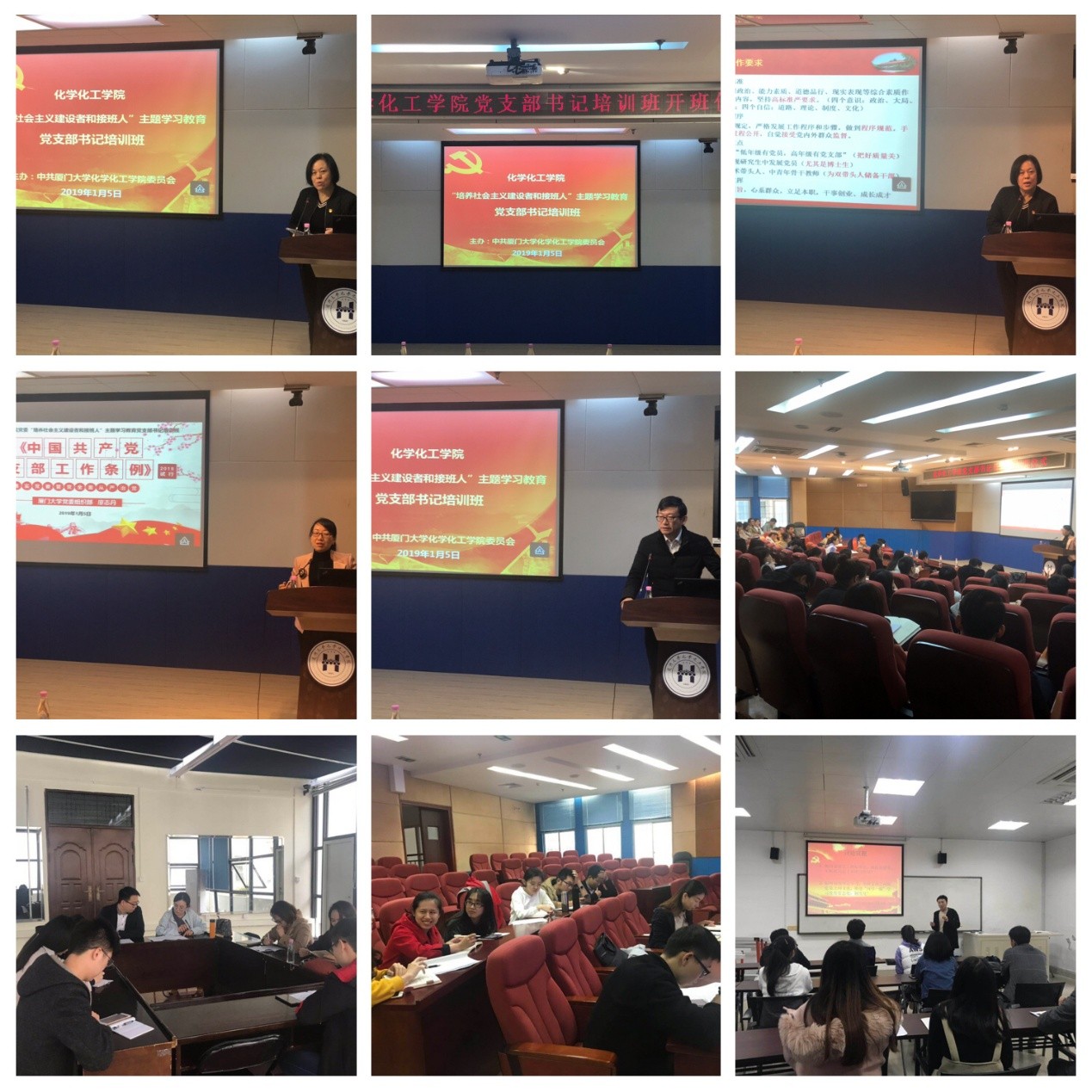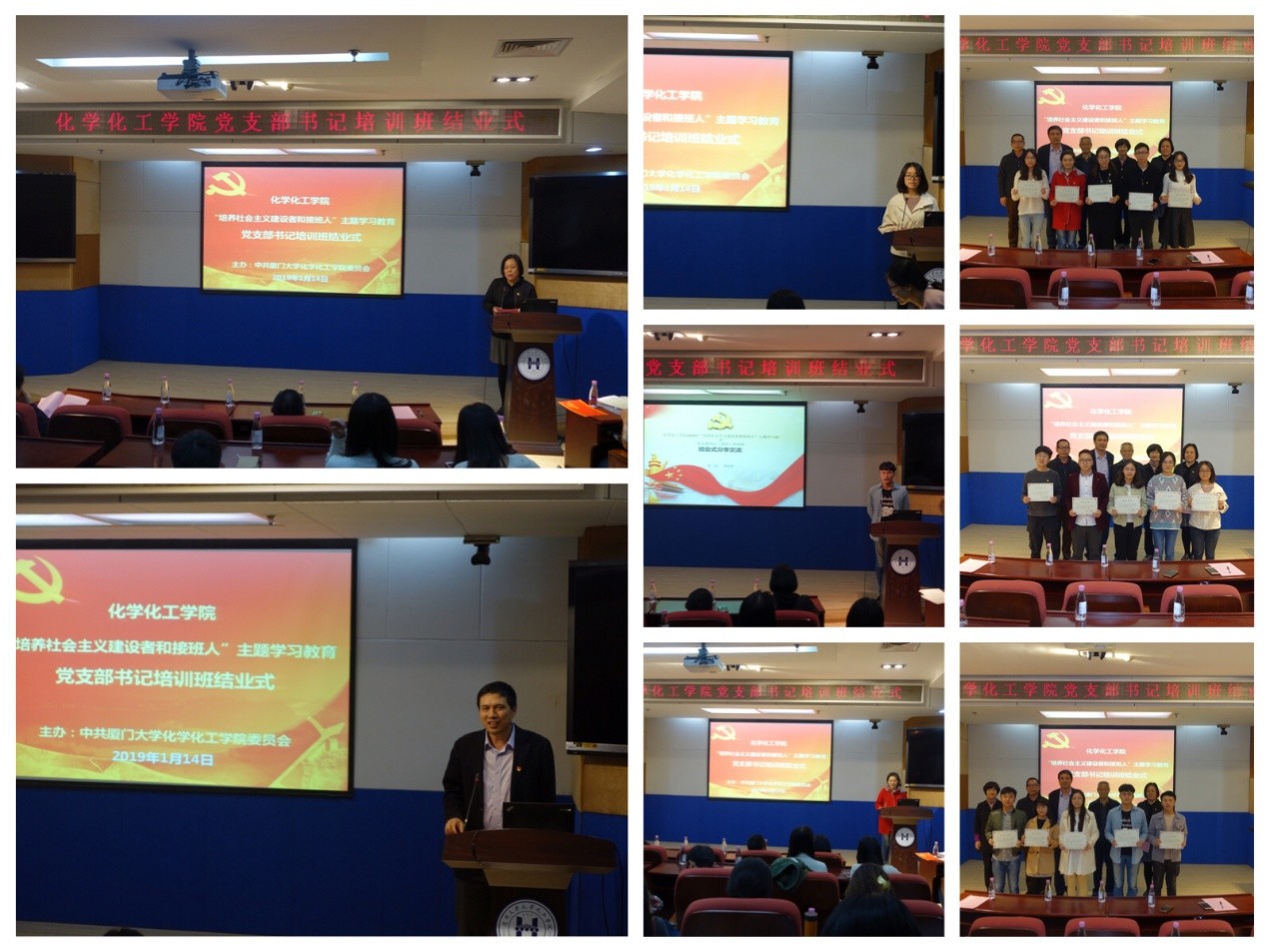为深入贯彻落实全国教育大会精神,落实立德树人根本任务,化学化工学院党委在全院师生中开展为期一个多月“培养社会主义建设者和接班人”主题学习教育活动。作为主题学习教育活动之一,1月5日,“培养社会主义建设者和接班人”主题学习教育之“扬才计划”党支部书记培训班在卢嘉锡楼202隆重开班。在两天内容丰富、形式新颖的集中培训学习与实践中,培训班特邀校党委组织部副部长廖志丹开课讲学,学院关工委常务副主任、学院党委党建组织员潘宝柱老师随行指导实践,1月14日下午,培训班结业式在嘉锡楼202顺利举行,本期党支部书记培训班圆满落下帷幕。学院党委书记宋毅,副书记、院长谢兆雄,副书记李芬芬、刘俊杰,党委委员朱亚先,党务秘书辛晓丹以及团委书记、辅导员等出席了培训班。培训班由党委副书记李芬芬主持,44名学生党支部书记作为学员参加学习。