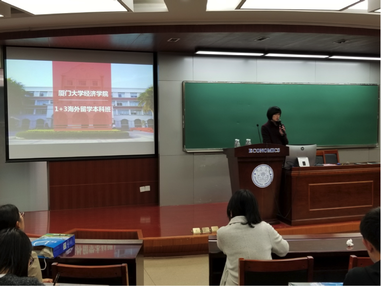 林嘉欣老师从学习模式、合作高校、准备课程和报名须知等方面介绍了经济学院“1+3”海外留学本科班项目。该项目已与爱尔兰都柏林大学、澳大利亚国立大学等10余所高校建立合作项目,项目申请难度小、方便、快捷,由海归师资团队全英文授课,可以共享厦大经济学科学术名牌资源,提高项目附加值。项目录取的主要影响因素由全英文面试、高考或高中在学成绩和英语及数学笔试组成。