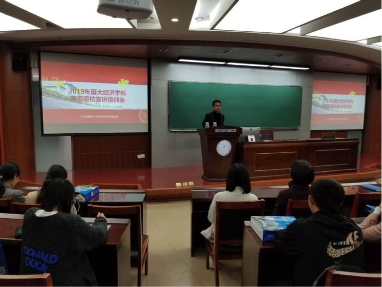 1月4日下午,厦大经济学科2019年寒假学生返校宣讲培训会在N302顺利举行。经济学院本科生教学部黄晨希老师、国际合作交流中心林嘉欣老师进行了宣讲培训,会议由经济学院辅导员刘长青主持。