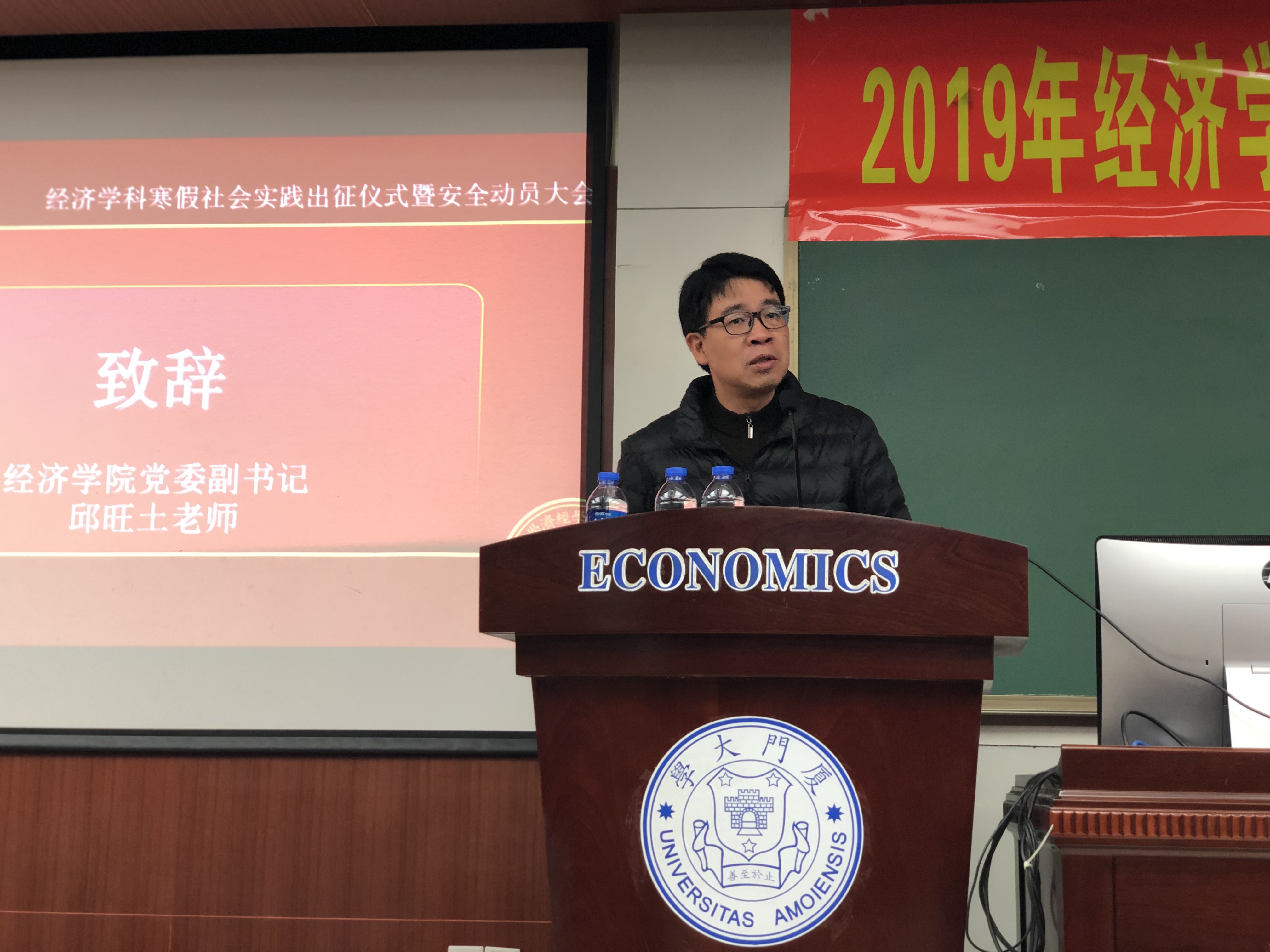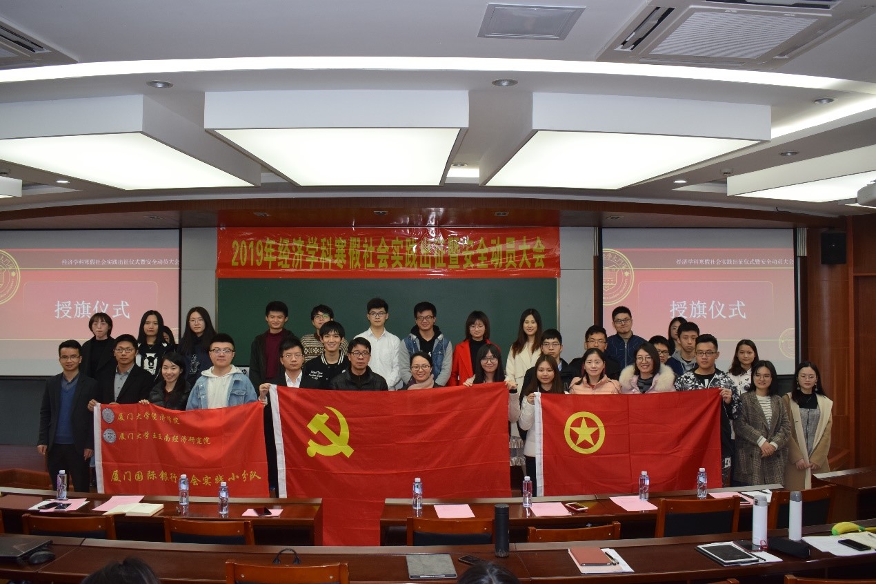 2019年1月3日下午,厦门大学经济学科2019年寒假社会实践出征仪式暨安全动员大会在经济楼N303举行。经济学院党委副书记邱旺土老师、团委副书记陈启妍老师、辅导员赵小姝、刘慧、林轶凡、刘长青和蔡庆淞老师出席了本次会议。