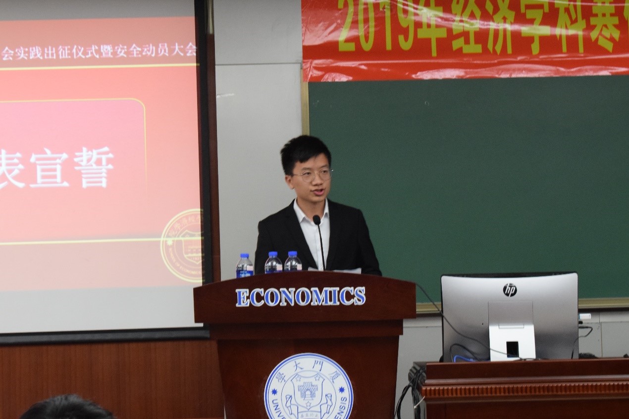 授旗仪式过后,由实践队队长代表陈毕郑重宣誓,一定会在老师的指导下,认真准备、团结协作、全力以赴,力争圆满完成预定的各项实践任务。实践队员们会本着坚定不移的心,去看、去思、去行,用努力和汗水去圆满地完成这次实践活动,同时一定遵守学院的实践安全条例,确保团队成员的实践安全。