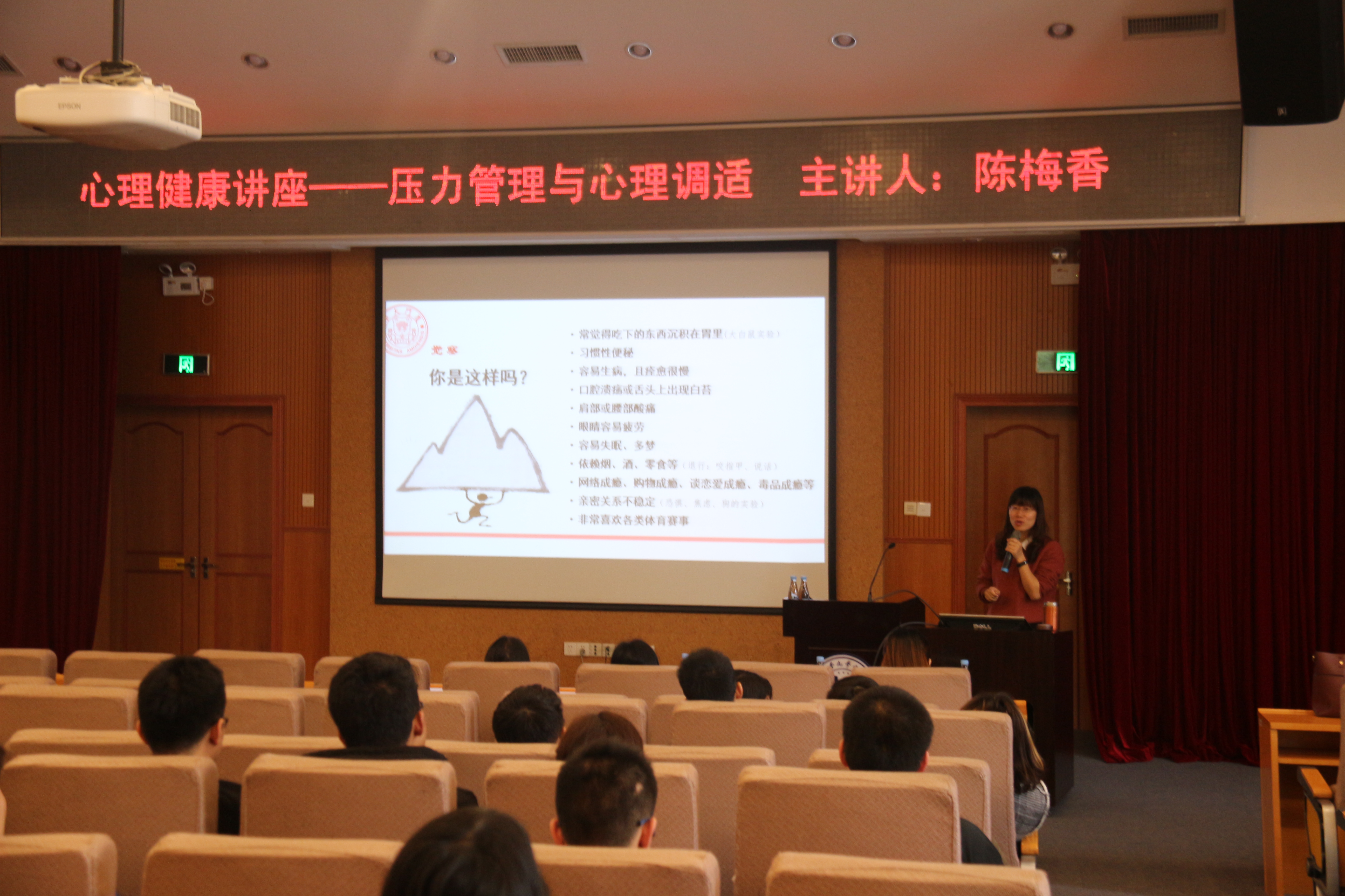 在讲座中,陈梅香博士结合专业知识、自身多年的实践经验及心理咨询实例,从研究生中普遍存在的学业压力、情感压力、师生关系压力、就业压力等方面出发,重点应用心理普查大数据分析了各个专业新生以及毕业生的压力状况,强调了不同程度的压力是普遍存在的,告诉同学们要正确面对压力,积极应对,不要畏惧或逃避。她还结合应用图片视觉测试的互动方法,进一步分享了压力通常会伴随着怎样的症状,以及如何觉察到自己存在压力,并分享了腹式呼吸放松法等自我化解压力的实用技巧。她强调,在压力面前,除了逃避和死扛,我们还可以有积极应对的第三种选择:“最幸福的人并不是没有压力的人,相反,他们是那些压力很大,但把压力看作朋友的人。这样的压力是生活的动力,也让我们的生活更有意义。”最后,她结合心理学科学研究,阐明行为可以改变情绪的观点,即当面临压力时,坐等只会将坏情绪越积越多,让压力越来越大,我们可以试着挺起胸膛、步子迈大、仪表整齐、坚定自己的信念,在行动中自然化解压力和获得正能量帮助自己不断前行。