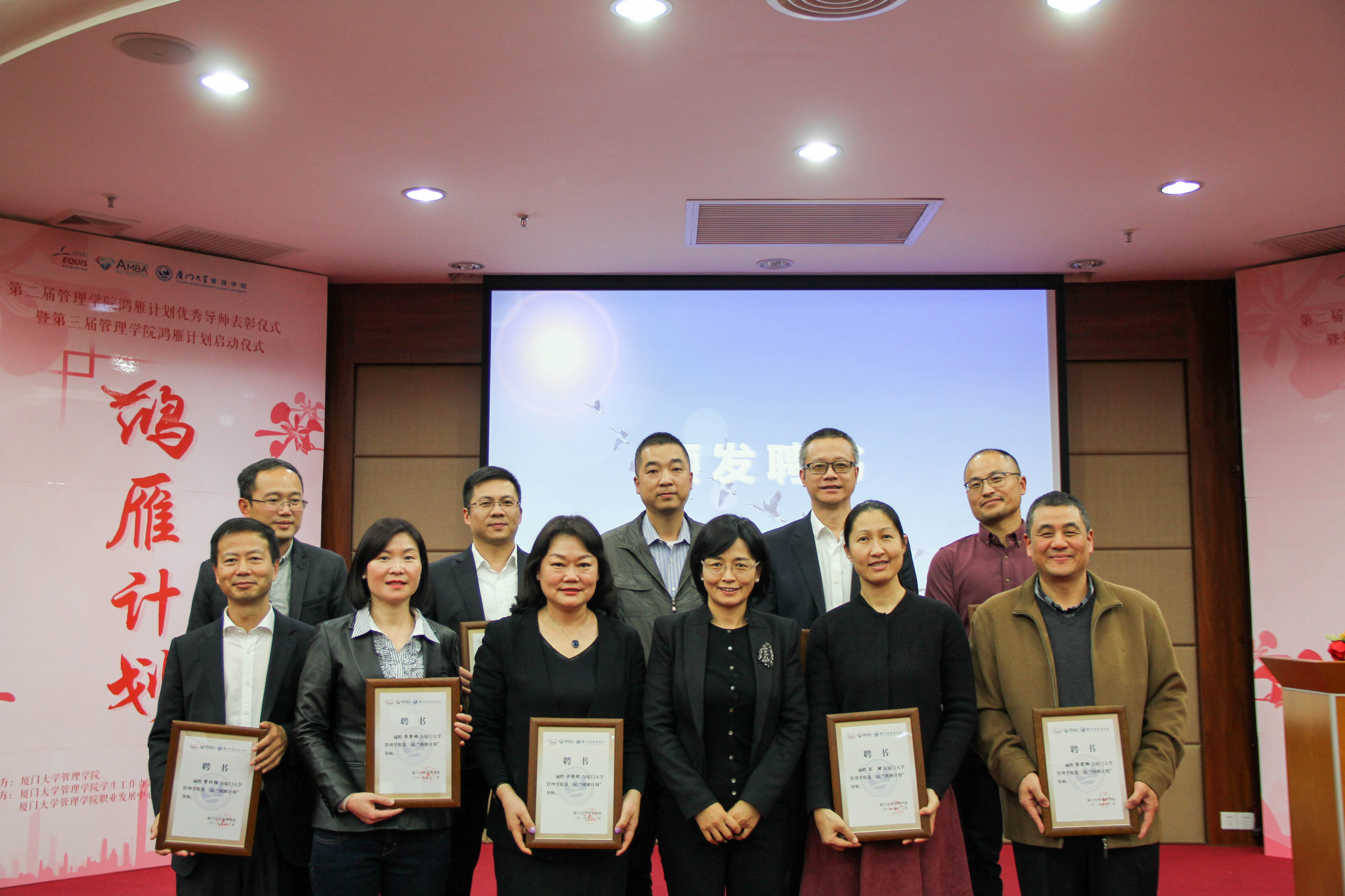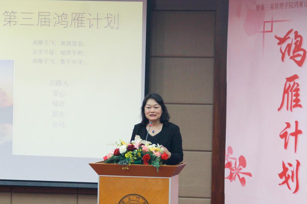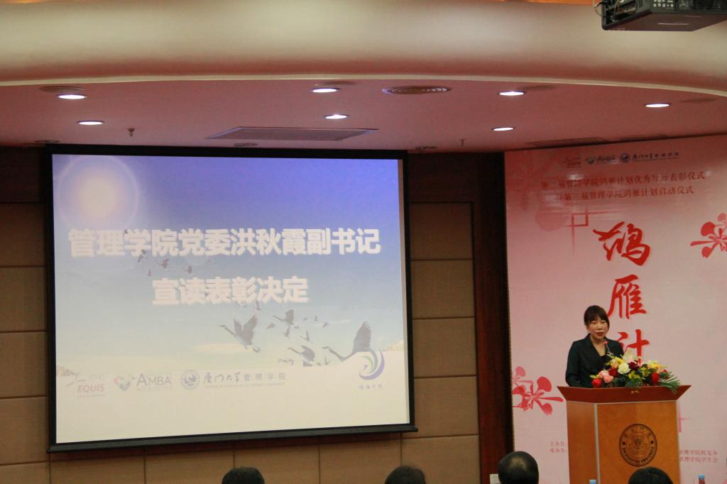 2018年12月28日晚,第二届管理学院鸿雁计划优秀导师表彰仪式暨第三届鸿雁计划启动仪式在克立楼三楼报告厅隆重召开。厦门大学校友总会副秘书长石慧霞,管理学院党委副书记洪秋霞、戴蓥以及第二届“鸿雁计划”优秀导师代表、第三届“鸿雁计划”导师代表,管理学院职业发展中心、校友办公室及学生工作办公室的老师们也出席了本次活动。学院职业发展中心主任王燊主持仪式。