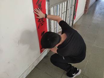 化学化工学院生活部成员在张贴对联(化学化工学院生活部/摄)