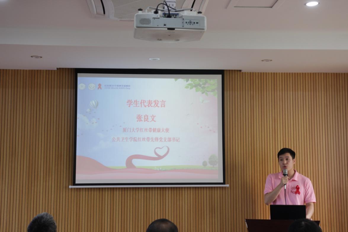 在宣传活动上,厦门大学红丝带大使、公共卫生学院红丝带先锋党支部书记张良文同学分享了开展防艾活动的经历与体会,号召广大青年大学生积极成为艾滋病防治与宣传教育的践行者。
