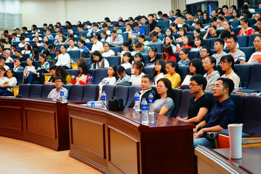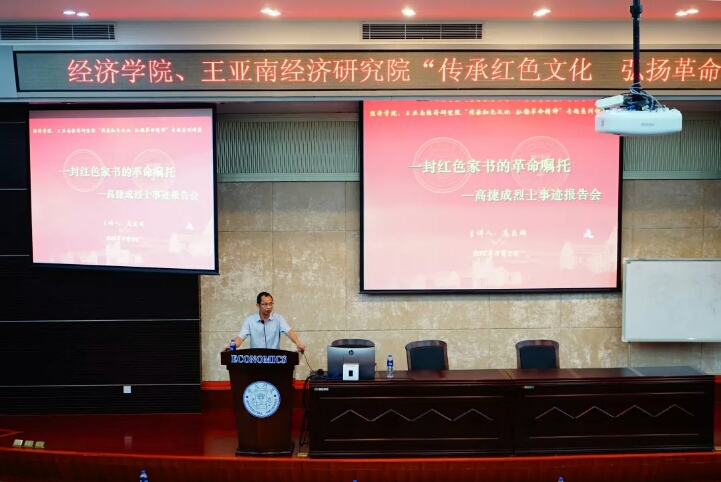 为全面振兴本科教育,教育部近来采取了一系列举措,召开了新时代高等学校本科教育大会,出台了系列政策。其中要求,要把思想政治教育贯穿高水平本科教育全过程,坚持德才兼修,提升思政工作质量。一直以来,厦门大学经济学科高度重视本科生的思想政治教育工作,11月5日,由厦门大学经济学院党委主办,厦大经济学院经济发展与传统文化研究中心协办,面向2018级新生的“传承红色文化弘扬革命精神”专题系列讲座第一讲于经济楼 N402举行,讲座主题为“一封红色家书的革命嘱托——高捷成烈士事迹报告会”。本次讲座由高庆麟(高捷成长孙)讲述厦门大学杰出校友、红军会计制度的创始人、中国共产党金融事业的奠基人之一高捷成烈士的传奇人生和光辉事迹。经济学院党政领导、师生代表近400人参加了此次讲座。经济学院党委书记黄鸿德主持此次讲座。