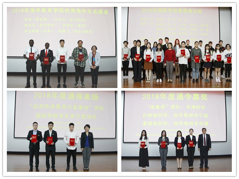 典礼最后,学院进行了表彰仪式,表彰2018年海外教育学院“优秀海外生志愿者”,颁发2018年国际学院雅思高分奖,同时表彰在创新竞赛、文体活动表现突出的团体或个人,对2015级本科生蓝子俊等4人组队的项目团队“启辰传承教育公益基金”、国际学院男子篮球队给予通报表扬;对第四届全国“互联网+”大学生创新创业大赛金奖项目“诺康得:全球首创CECT-NK疗法战胜白血病”团队成员、2015级本科生苏博,在第二届“汉教英雄会”汉语教学大赛全国总决赛中获得三等奖的白婷丽同学、获得“优秀指导教师”的肖宁遥老师,在第三届“中国高校大学生侍酒师大赛”决赛中获得“最佳人气奖”的姜慧染同学、指导老师史凤霞老师给予通令嘉奖。